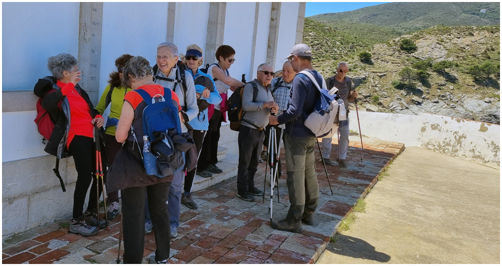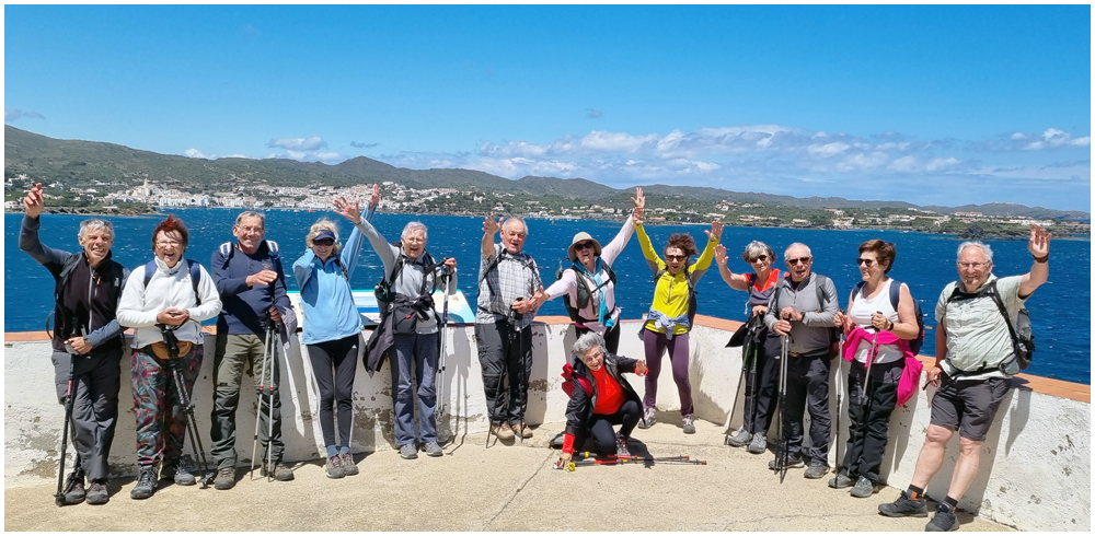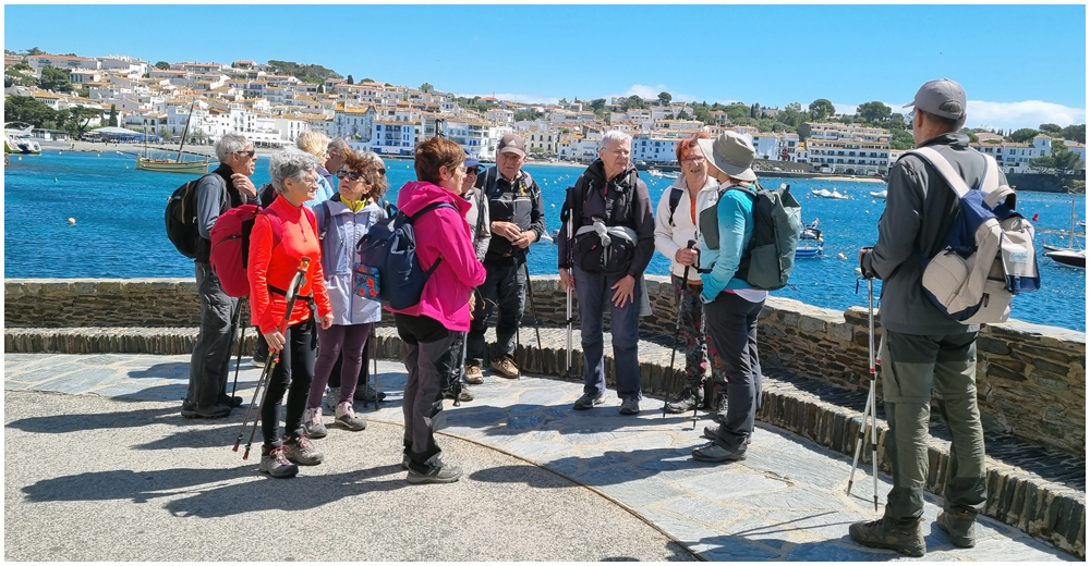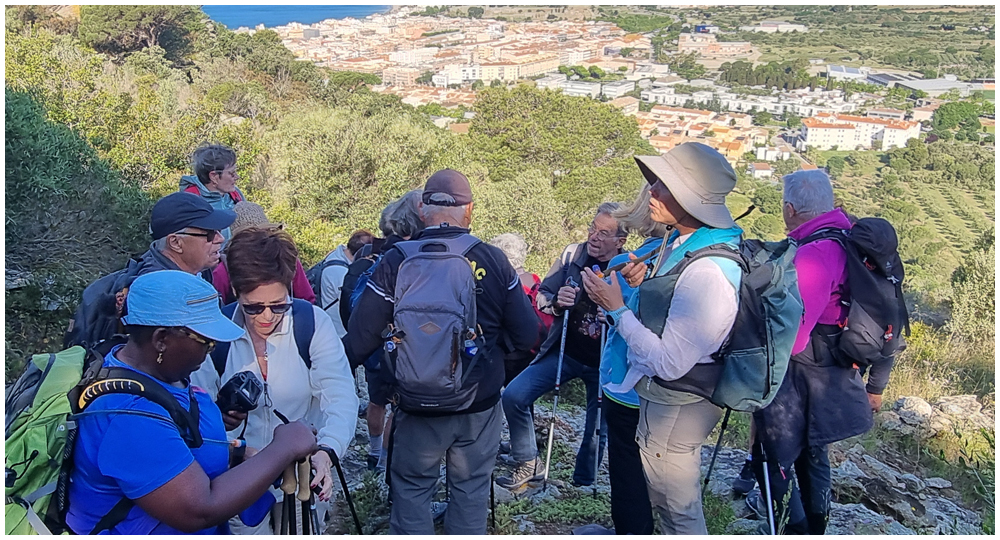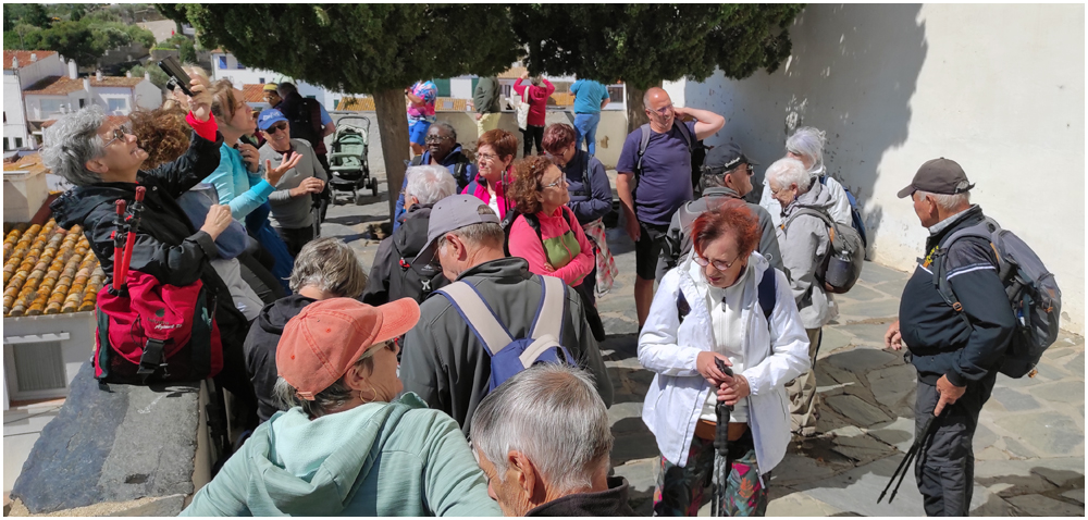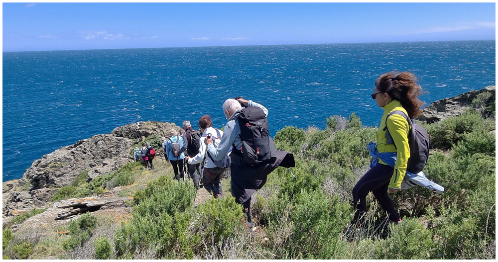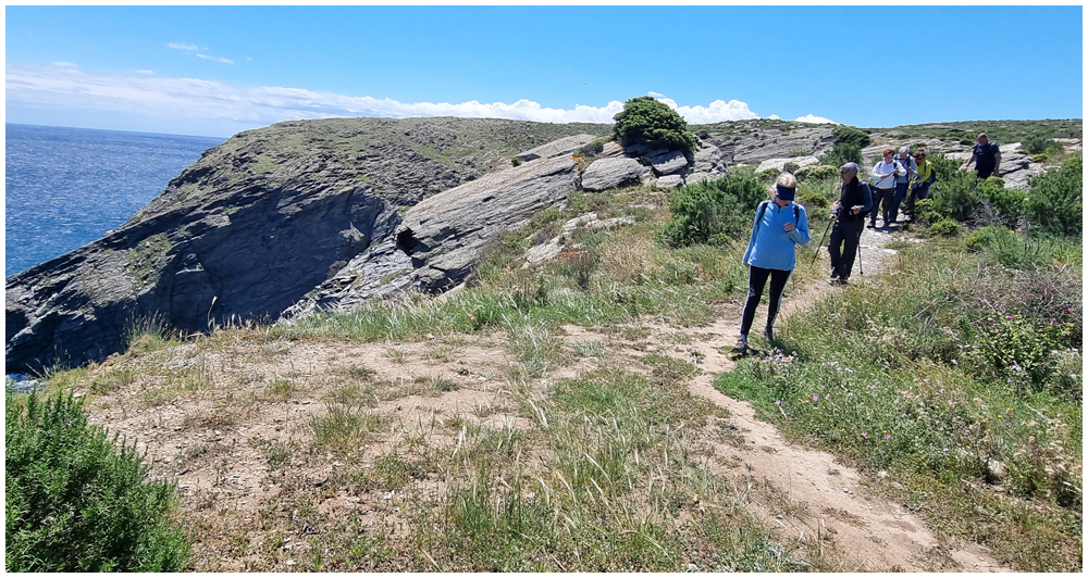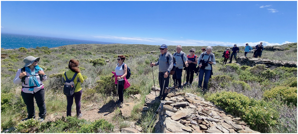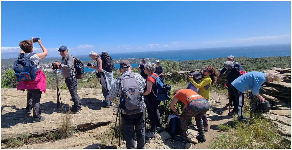 Ce matin à 08h30, Angèls nous détaille la randonnée à venir ainsi que l’organisation prévue pour tous les déplacements en co-voiturage de la semaine. Chaque passager avant est ainsi doté d’un Talkie walkie lui permettant de communiquer avec les autres véhicules, Angèls se trouvant en tête pour annoncer les directions à prendre et Marie-Claire se voyant attribuer – avec succès – la voix de la voiture serre-file. Pour la randonnée en boucle – qui s’avérera plutôt « ardue » aux dires des participants – son départ est prévu de la crique de « Cala Montjoi » et doit nous permettre de rejoindre les crêtes qui dominent le Cap Norfeu, réserve intégrale dans le parc du Cap de Creus. La fin du parcours se fera par un sentier longeant le bord de mer. (Crédit photos: Alain, Eugène & Marie-Jacqueline)