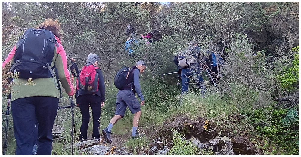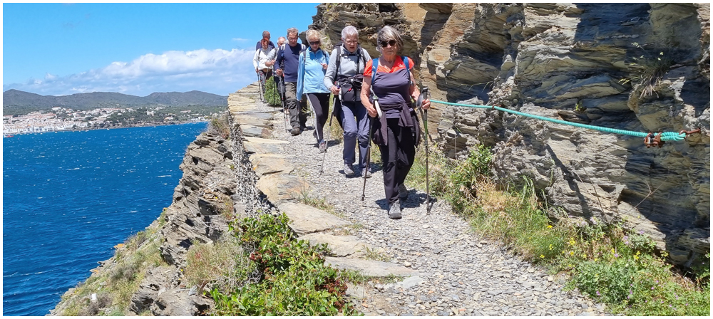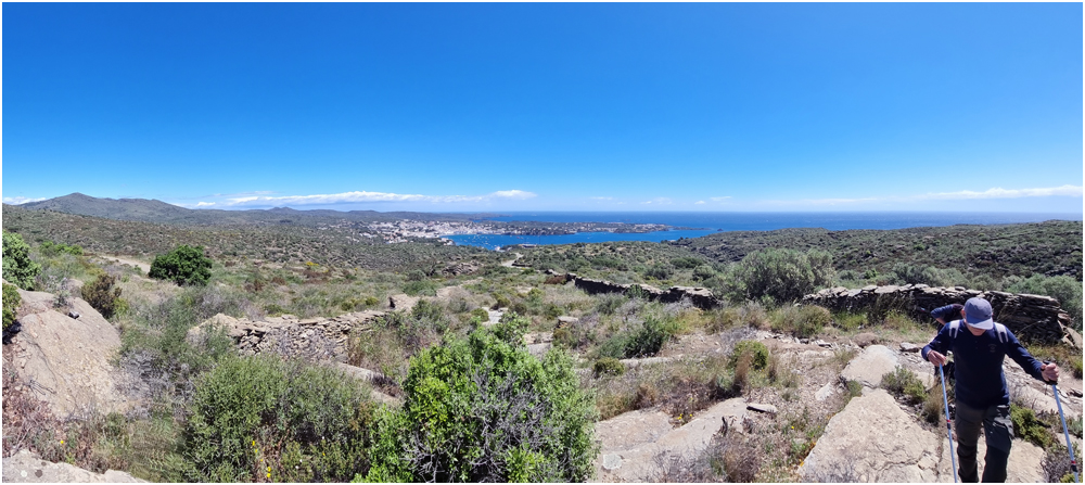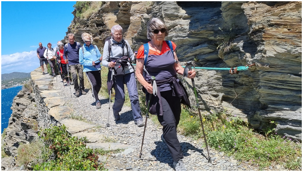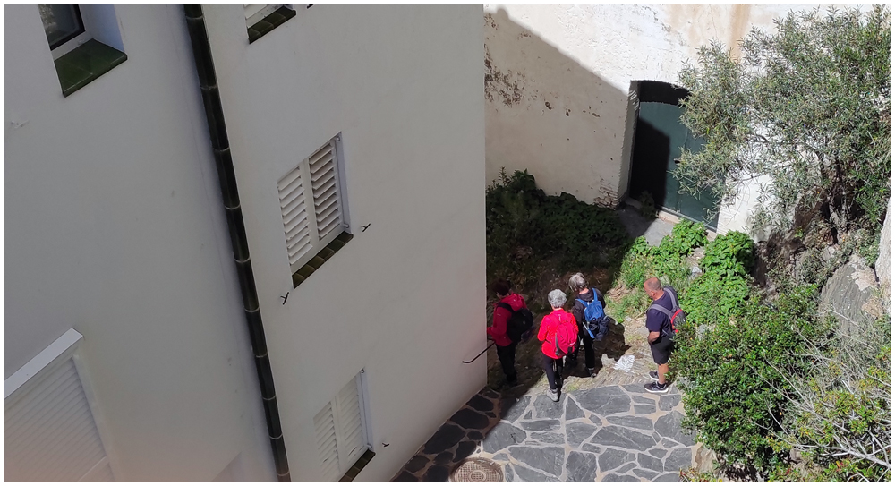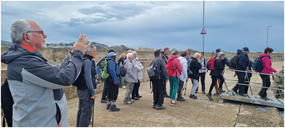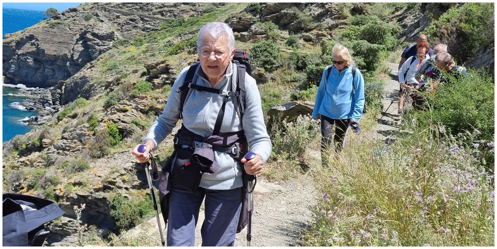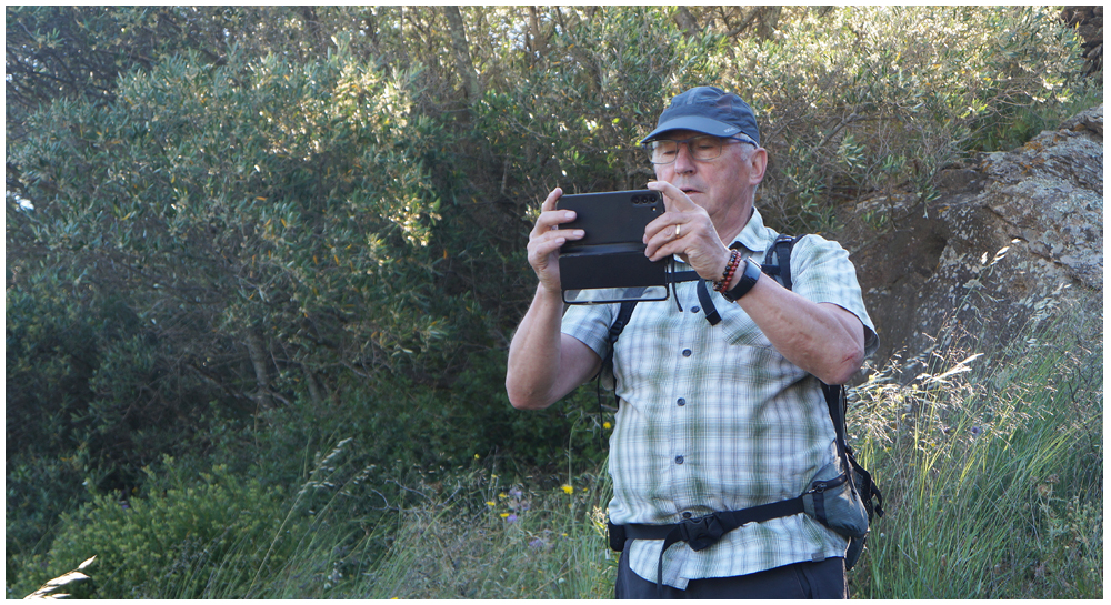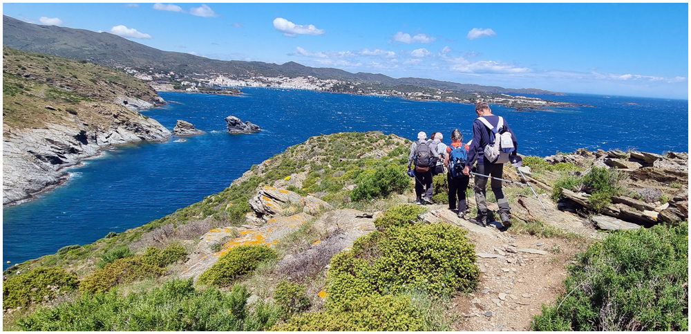 Ce matin à 08h30, Angèls nous détaille la randonnée à venir ainsi que l’organisation prévue pour tous les déplacements en co-voiturage de la semaine. Chaque passager avant est ainsi doté d’un Talkie walkie lui permettant de communiquer avec les autres véhicules, Angèls se trouvant en tête pour annoncer les directions à prendre et Marie-Claire se voyant attribuer – avec succès – la voix de la voiture serre-file. Pour la randonnée en boucle – qui s’avérera plutôt « ardue » aux dires des participants – son départ est prévu de la crique de « Cala Montjoi » et doit nous permettre de rejoindre les crêtes qui dominent le Cap Norfeu, réserve intégrale dans le parc du Cap de Creus. La fin du parcours se fera par un sentier longeant le bord de mer. (Crédit photos: Alain, Eugène & Marie-Jacqueline)