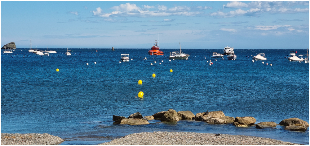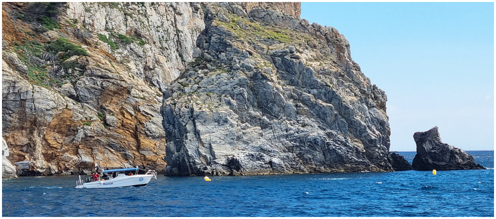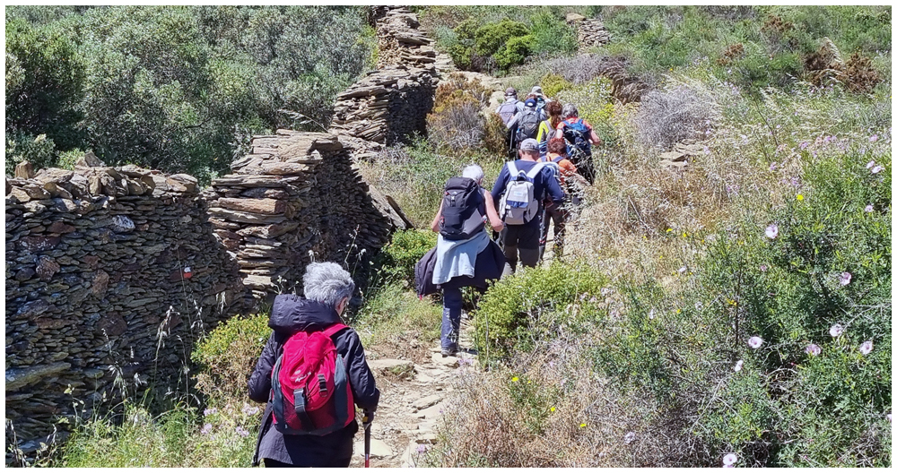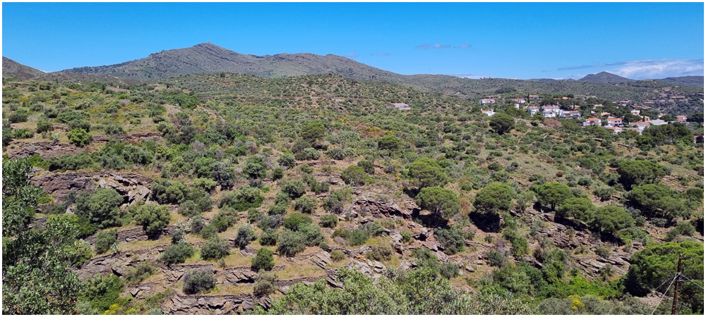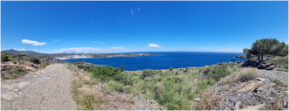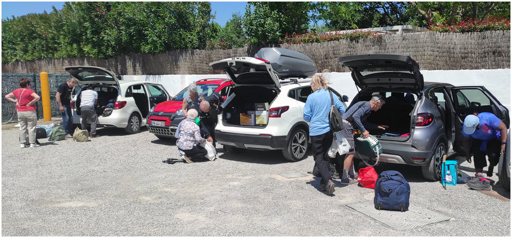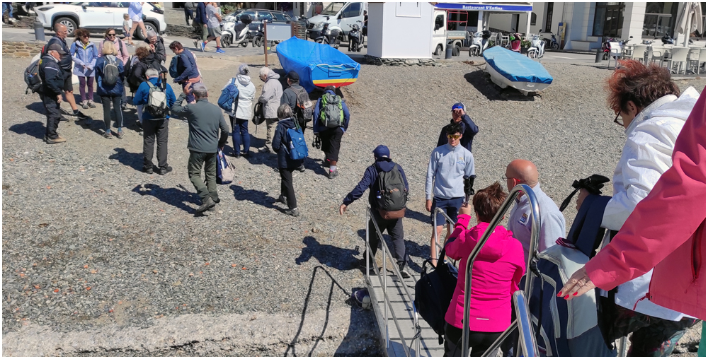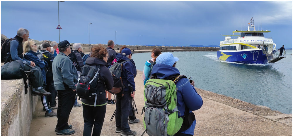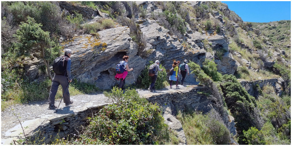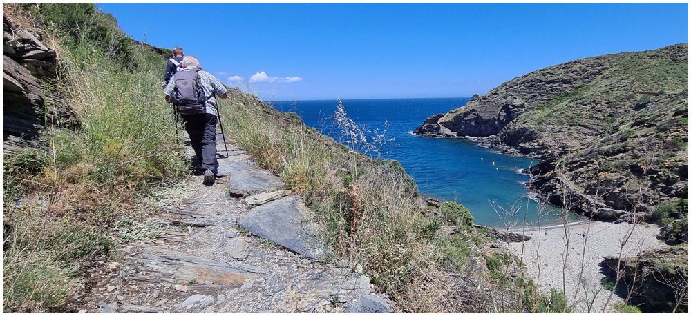 Ce matin à 08h30, Angèls nous détaille la randonnée à venir ainsi que l’organisation prévue pour tous les déplacements en co-voiturage de la semaine. Chaque passager avant est ainsi doté d’un Talkie walkie lui permettant de communiquer avec les autres véhicules, Angèls se trouvant en tête pour annoncer les directions à prendre et Marie-Claire se voyant attribuer – avec succès – la voix de la voiture serre-file. Pour la randonnée en boucle – qui s’avérera plutôt « ardue » aux dires des participants – son départ est prévu de la crique de « Cala Montjoi » et doit nous permettre de rejoindre les crêtes qui dominent le Cap Norfeu, réserve intégrale dans le parc du Cap de Creus. La fin du parcours se fera par un sentier longeant le bord de mer. (Crédit photos: Alain, Eugène & Marie-Jacqueline)