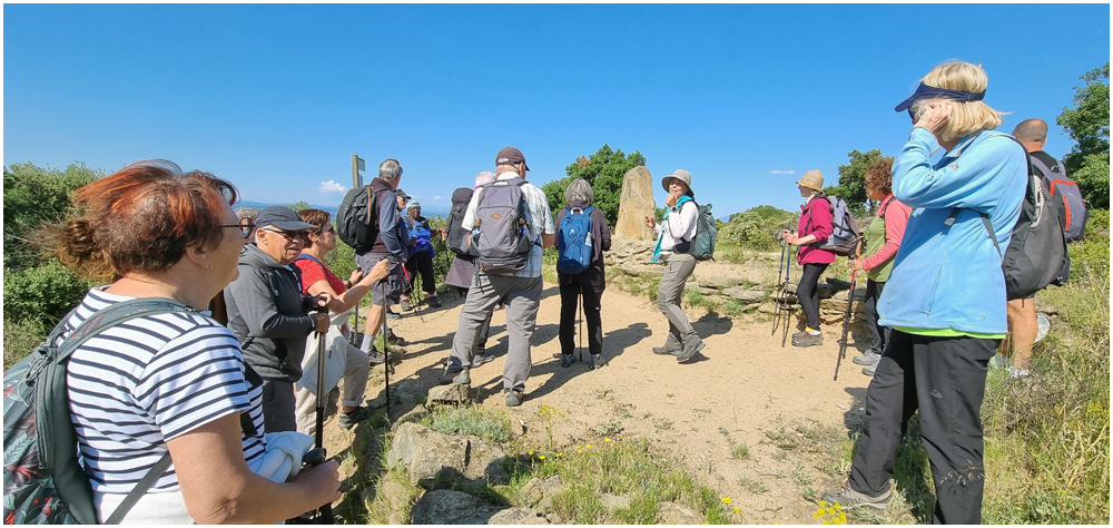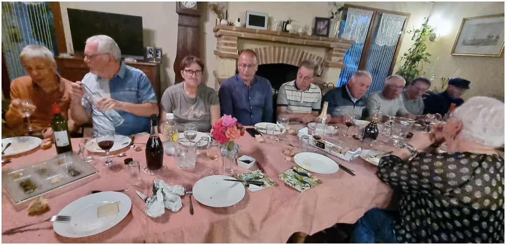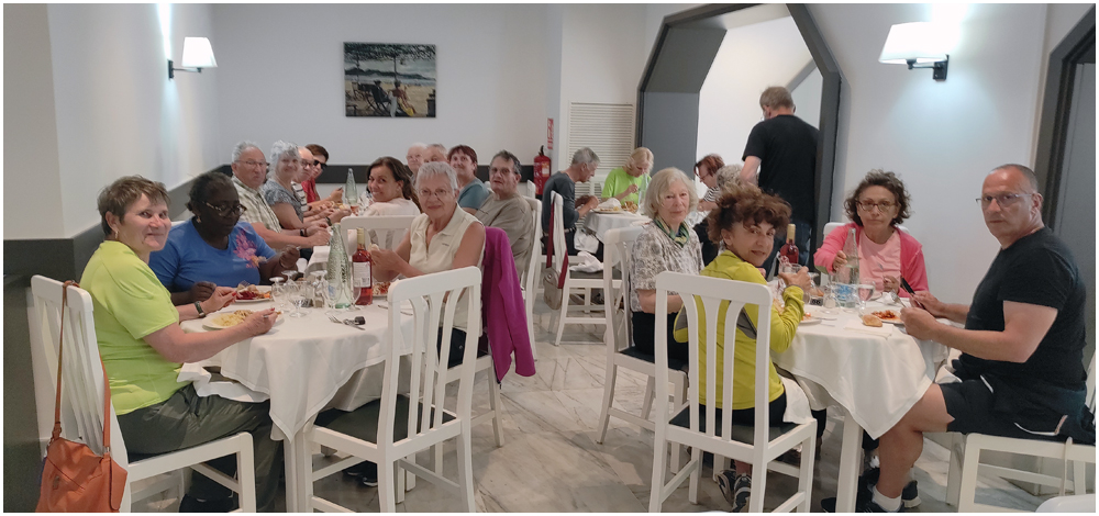 Le samedi 21 juin 2025 toute la journée, randonnée proposée par Eugène entre Najac et Laguépie. Stationnés à la gare de Laguépie nous prendrons le train qui nous déposera, quelques dix minutes plus tard, à la gare de Najac, point de départ de notre circuit. Pour satisfaire tous les participant(e)s deux seront proposés : un complet de 16km300 et une variante de 13km. Autant le dire maintenant, la journée fut dure en raison de la distance, du dénivelé et surtout de la chaleur accablante qui nous accompagnera toute la journée. A l’heure du pique-nique nous nous retrouverons tous autour de la table d’un « Accueil de Pèlerins » rencontré sur notre parcours. Nous y découvrirons une pratique liée aux chemins de pèlerinage, le « Donavito » consistant à donner la somme qui paraît juste pour la nuitée ou la demi-pension ainsi que toutes autres prestations. Son origine historique vient du souhait de permettre à tout le monde, notamment aux plus démunis, d’effectuer le pèlerinage à Compostelle. (Crédit photos: Eugène)